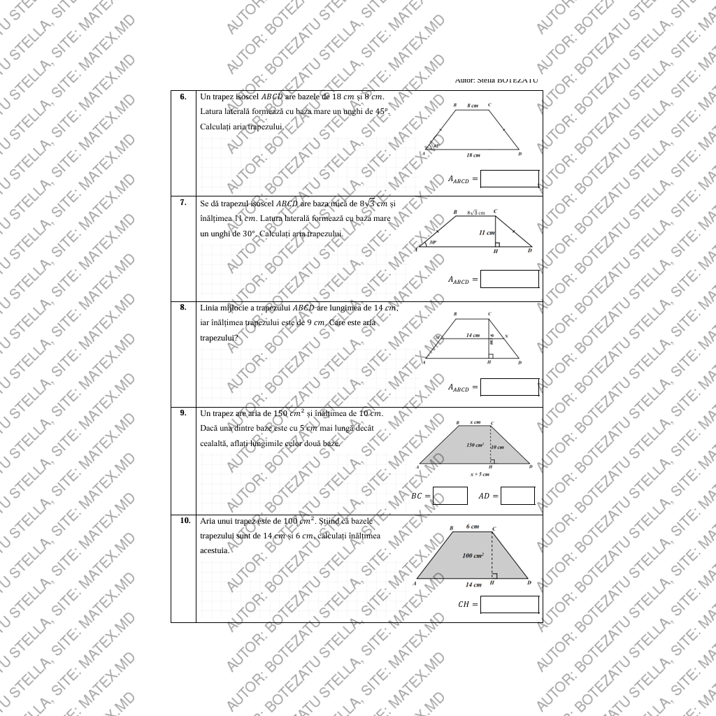 ✔ Include exerciții diverse: calculul ariei, determinarea bazelor, calculul înălțimii, trapeze cu unghiuri speciale, probleme cu linia mijlocie.