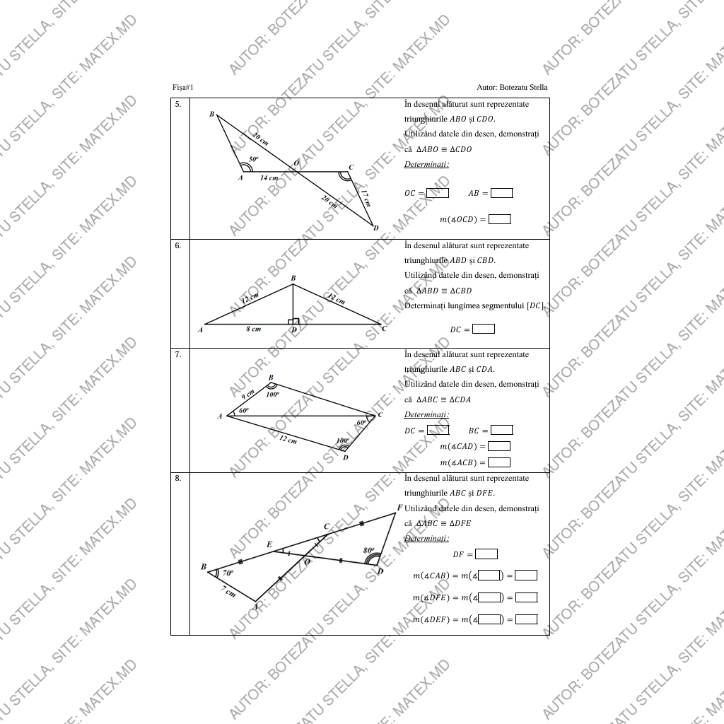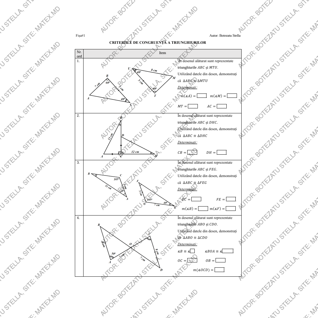 Această fișă de lucru este destinată elevilor de clasa a VII-a și abordează tema „Criteriile de congruență a triunghiurilor” prin exerciții vizuale și riguroase. Materialul include diagrame detaliate ale perechilor de triunghiuri, însoțite de cerințe de demonstrare a congruenței pe baza criteriilor LUL, ULU, LLL și variante combinate. Fiecare item solicită determinarea unor unghiuri, lungimi de segmente, egalități de măsuri sau relații geometrice, dezvoltând atât raționamentul demonstrativ, cât și abilitățile de analiză în desen.