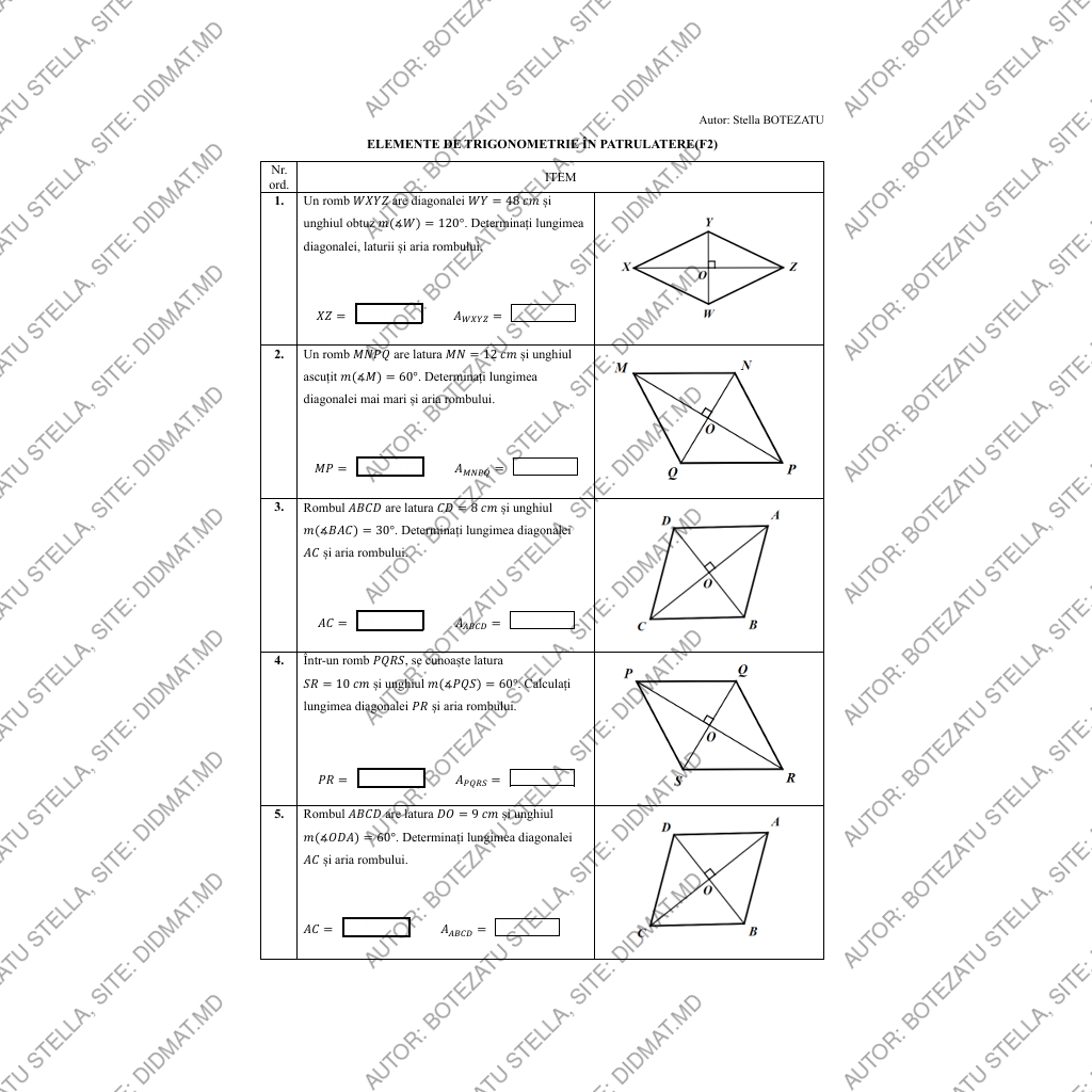 Această fișă de lucru este concepută pentru formarea și consolidarea deprinderilor de aplicare a relațiilor trigonometrice în patrulătere, fiind adaptată nivelului elevilor de clasa a IX-a.
