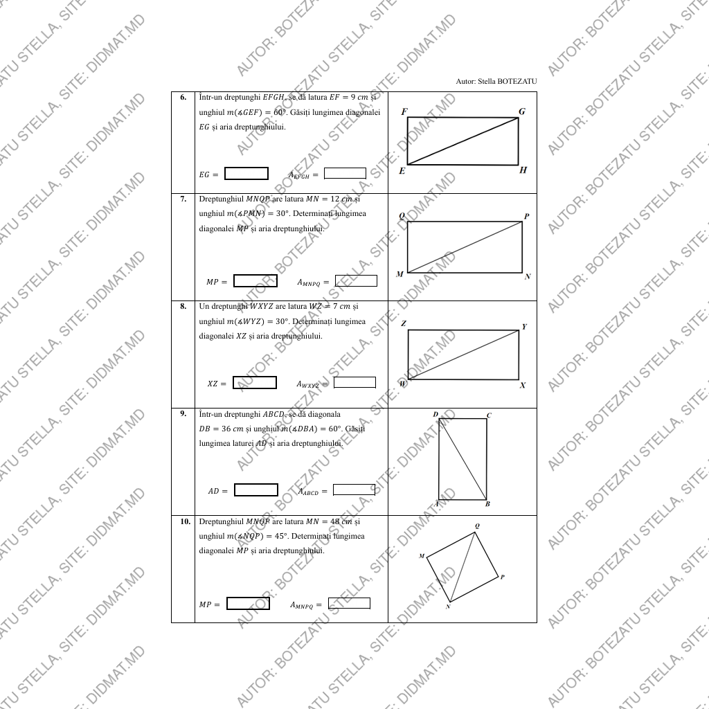- determinarea diagonalei și ariei dreptunghiului cunoscând o latură și un unghi format cu diagonala;