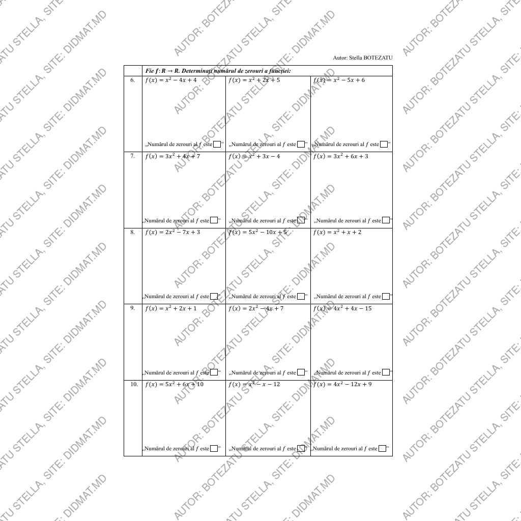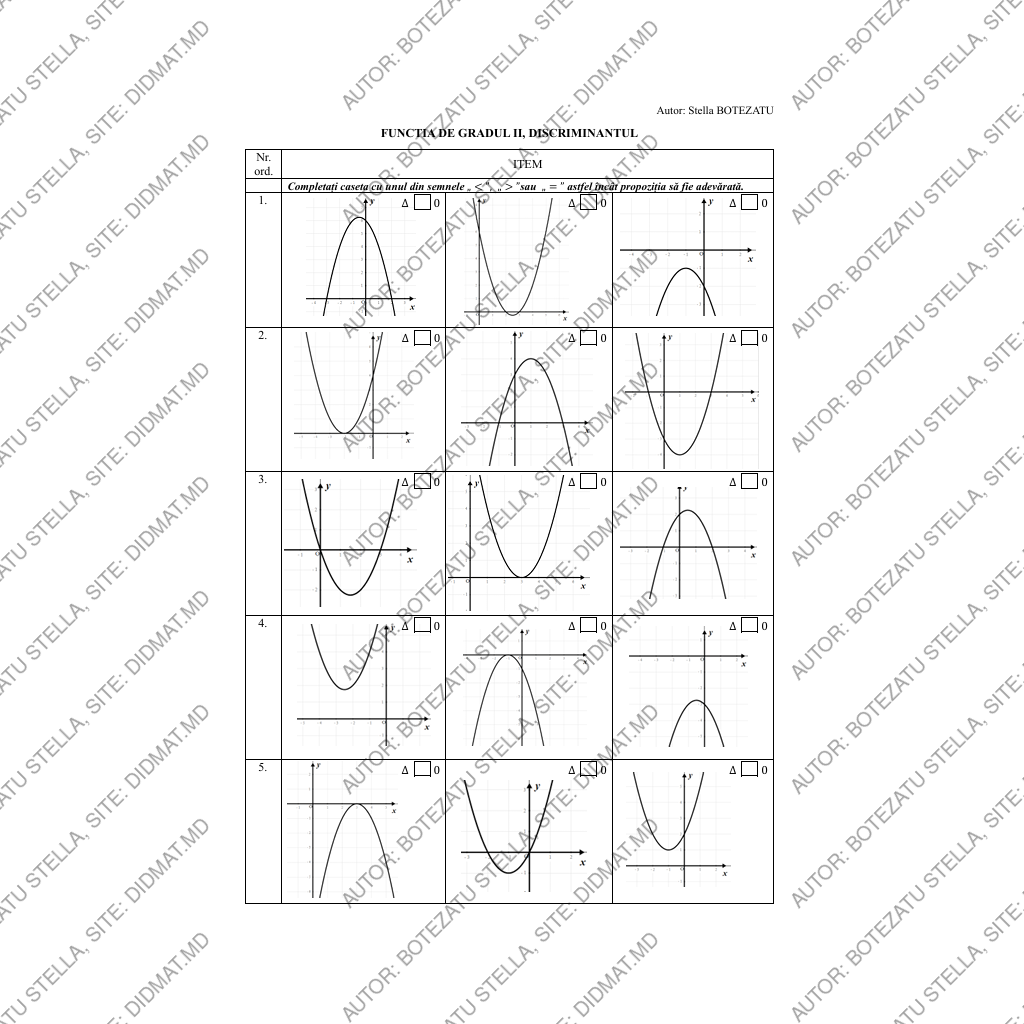 Această fișă de lucru este concepută pentru formarea și consolidarea deprinderilor de lucru cu funcția de gradul II și discriminantul acesteia, fiind adaptată nivelului elevilor de clasa a IX-a.
