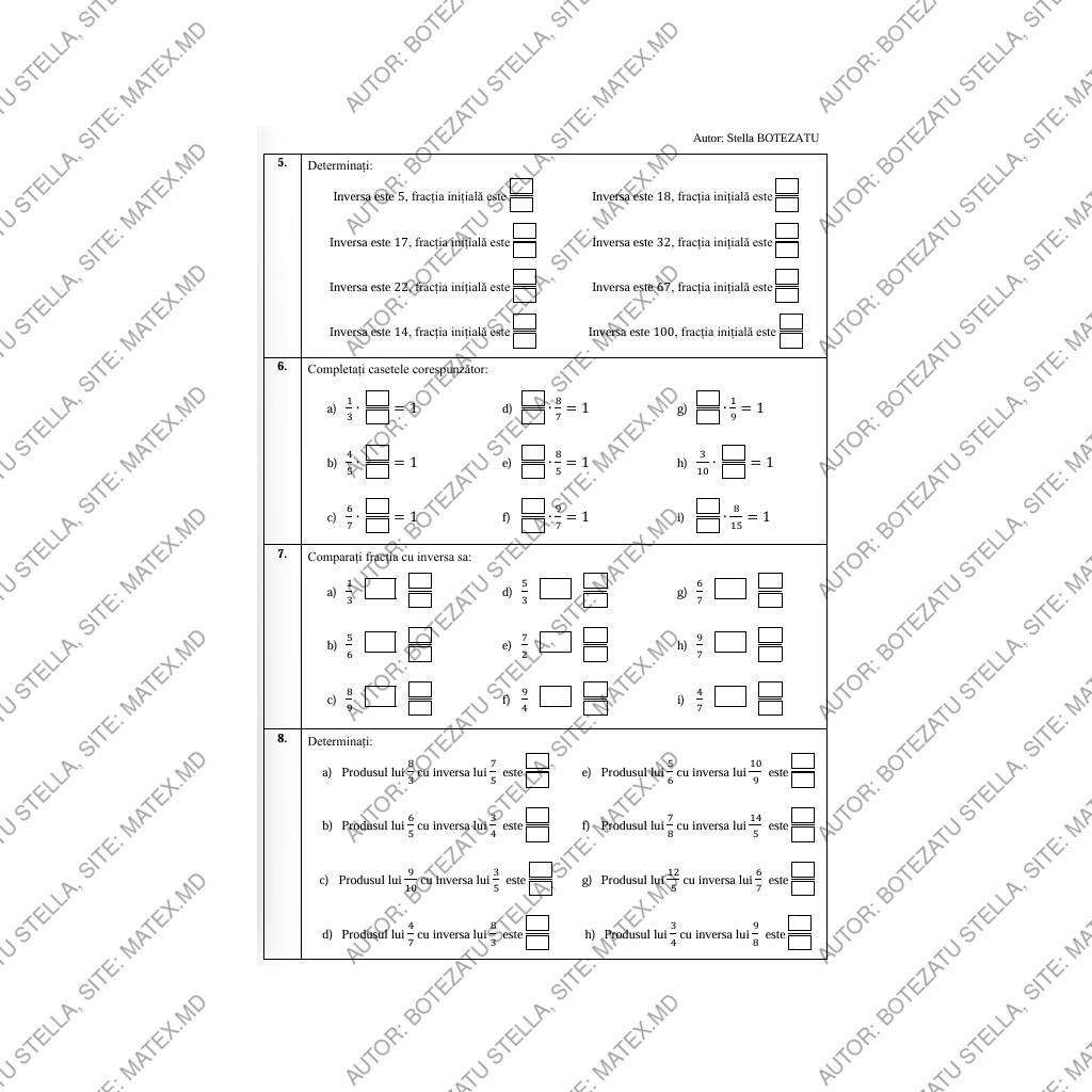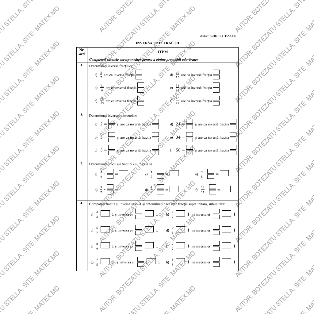 Această fișă de lucru este concepută pentru predarea, exersarea și consolidarea noțiunii de inversa unei fracții, conform programei școlare pentru clasa a V-a.