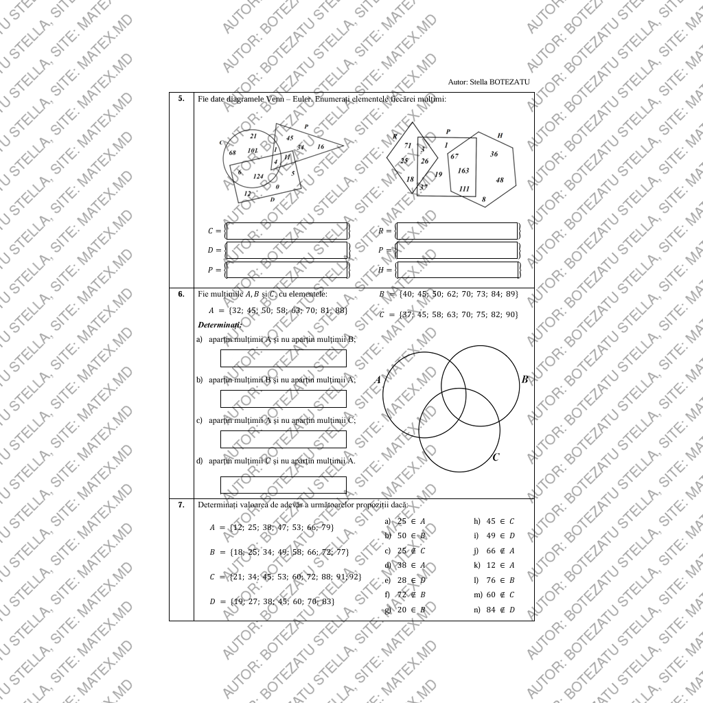 Fișa include activități de completare cu simbolurile „∈” și „∉”, exerciții de determinare a cardinalului mulțimilor, identificarea submulțimilor, precum și itemi ce presupun clasificări corecte în funcție de criterii numerice sau logice. De asemenea, fișa conține diagrame Venn complexe care îi ajută pe elevi să vizualizeze relațiile dintre mulțimi și să identifice rapid elementele comune, deosebirile și zonele specifice fiecărei mulțimi.