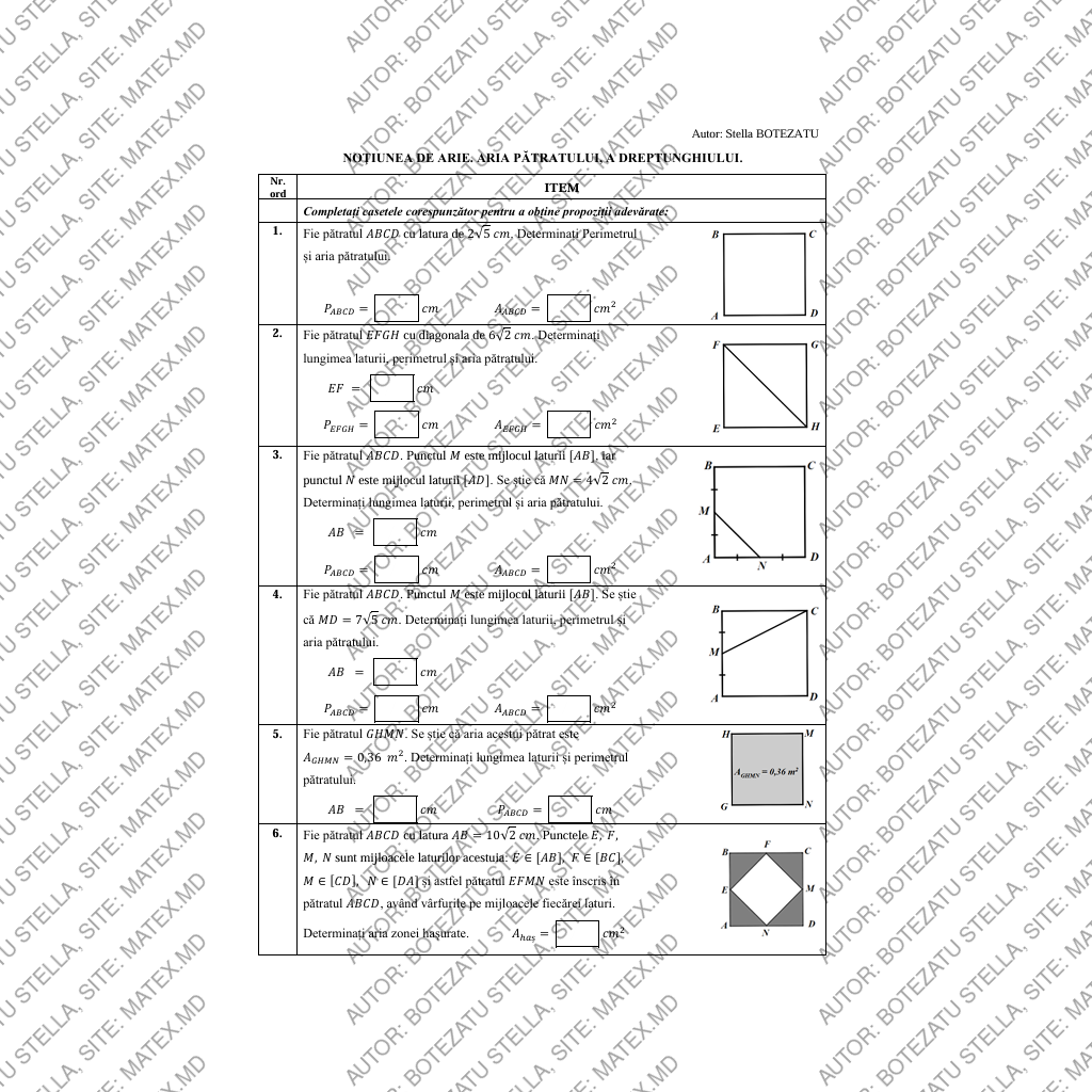 • determine lungimea laturii pătratului din arie sau diagonală;