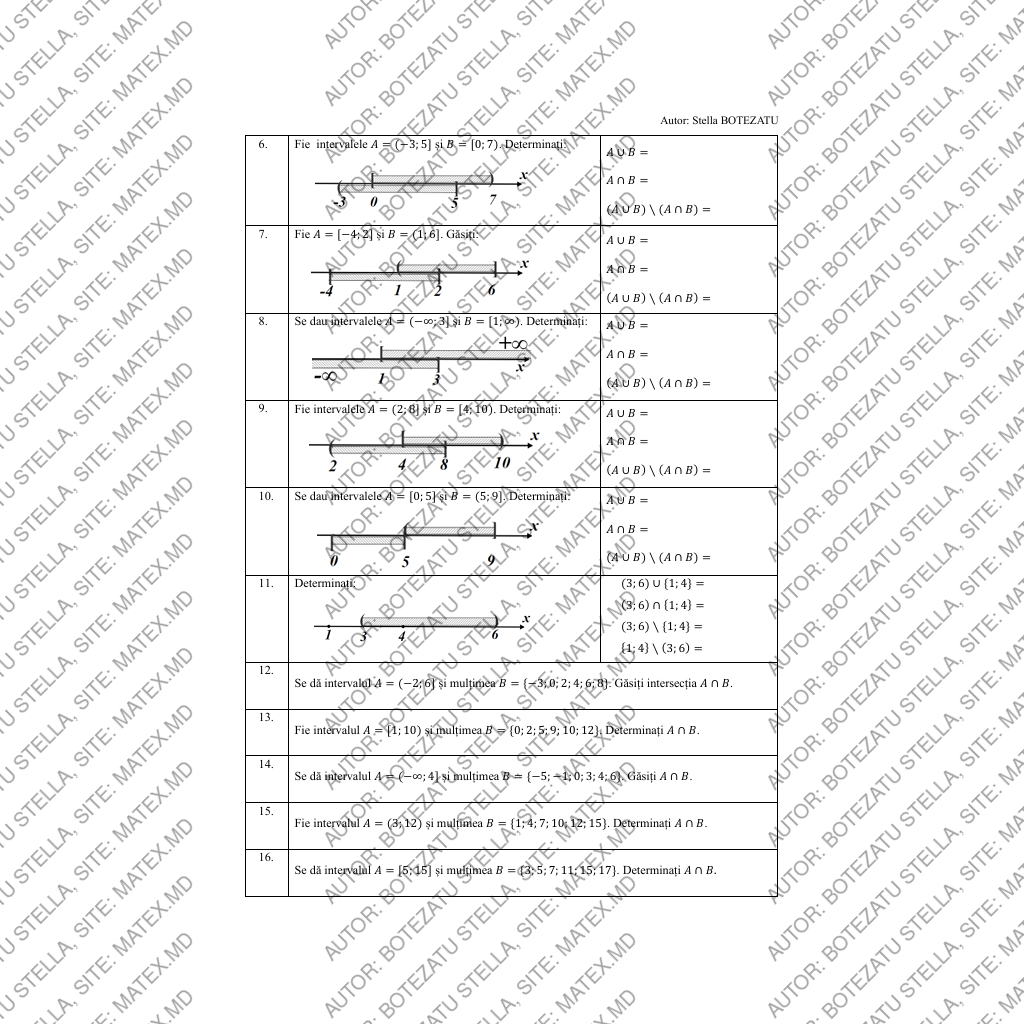 • operații între intervale deschise, închise, semideschise și intervale infinite;