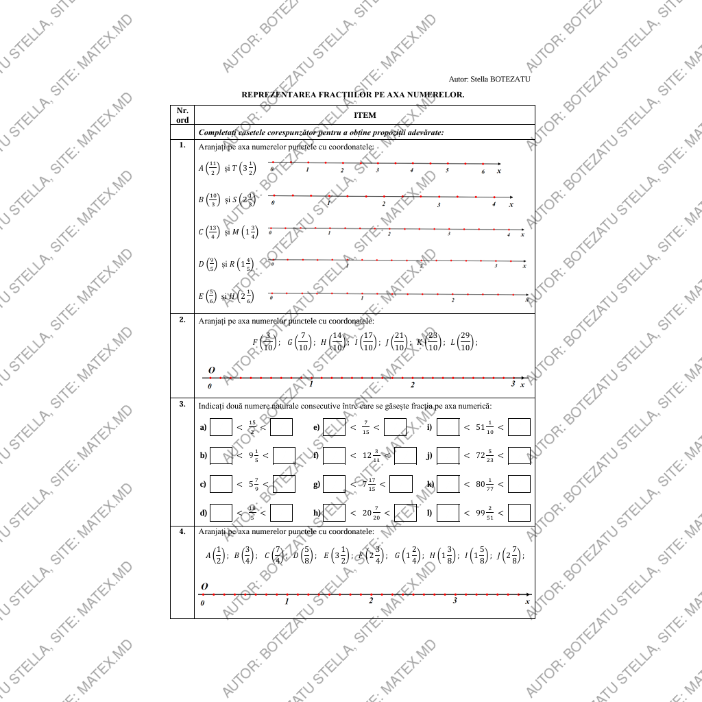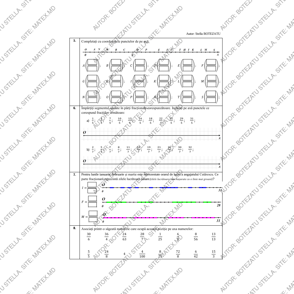 Fișă de lucru pentru clasa a V-a la tema „Reprezentarea fracțiilor pe axa numerelor”. Materialul conține exerciții gradate: plasarea fracțiilor și a numerelor mixte pe axă, identificarea intervalului dintre două numere naturale consecutive, determinarea coordonatelor punctelor, împărțirea segmentului-unitate în părți egale, asocierea fracțiilor cu aceeași poziție pe axă și probleme aplicative cu context real (zile lucrătoare, orar, etc.). Fișa poate fi folosită atât la predare, cât și la consolidare sau evaluare formativă, fiind potrivită pentru lucru individual, în perechi sau pe grupe cât și pentru elevii cu cerințe educaționale speciale(CES).
