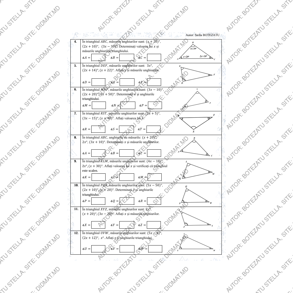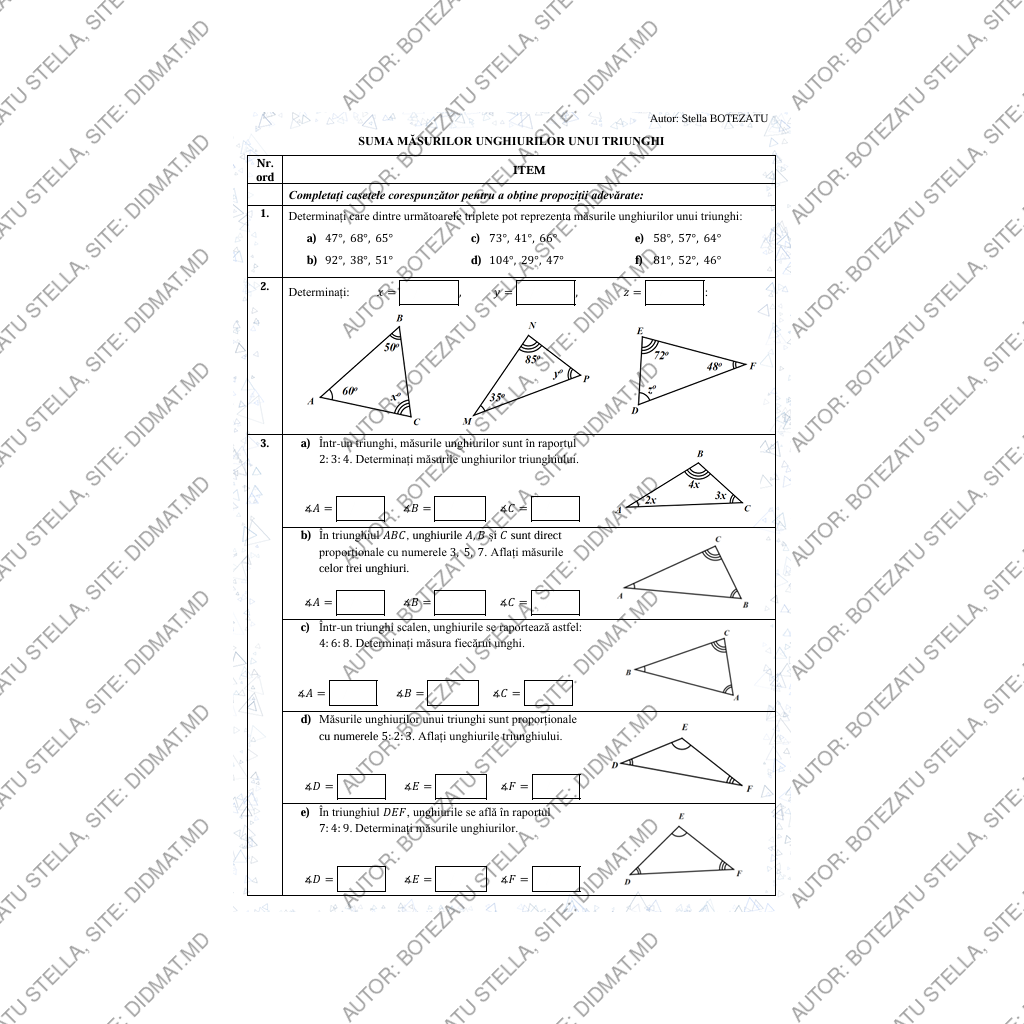 Această fișă de lucru abordează una dintre cele mai importante baze ale geometriei: suma unghiurilor într-un triunghi.