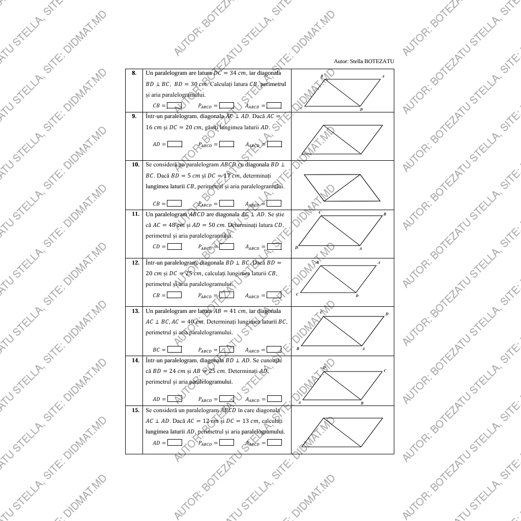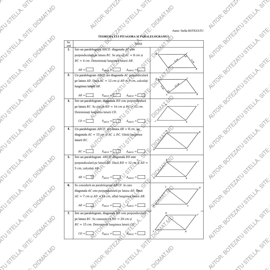 Această fișă de lucru este concepută pentru formarea și consolidarea deprinderilor de aplicare a teoremei lui Pitagora în contextul paralelogramului, fiind adaptată nivelului elevilor de clasa a VIII-a.