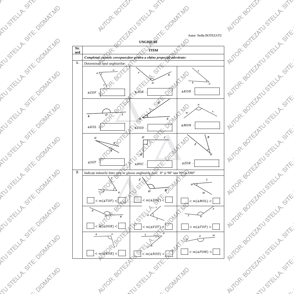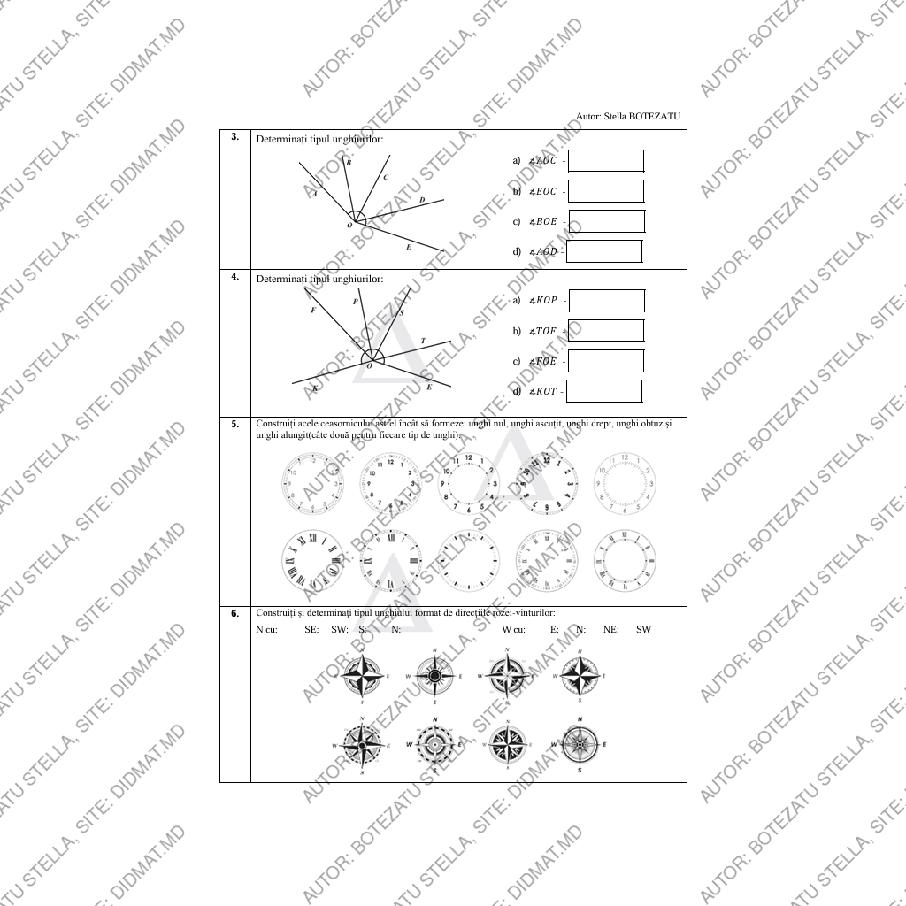 Această fișă de lucru este concepută pentru elevii de gimnaziu (clasa a V-a – a VI-a) și abordează tema „Unghiuri” într-un mod vizual, aplicativ și intuitiv.